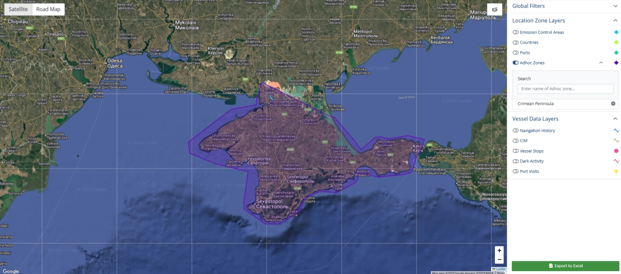 The Adhoc Zones layer highlights custom areas of interest - such as sanctioned or high-risk locations - directly on the map.