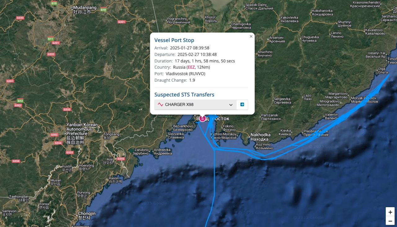 By combining vessel stop and dark activity insights, Mainstay STS layer helps assess whether an unauthorised ship-to-ship (STS) transfer may have occurred.
