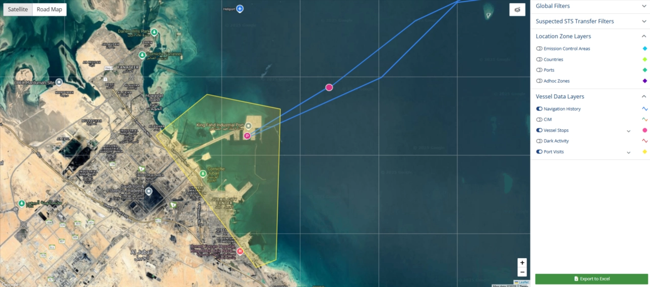 The Vessel Stops layer helps identify port activity, potential STS events, and key operational patterns — all with clarity and precision.