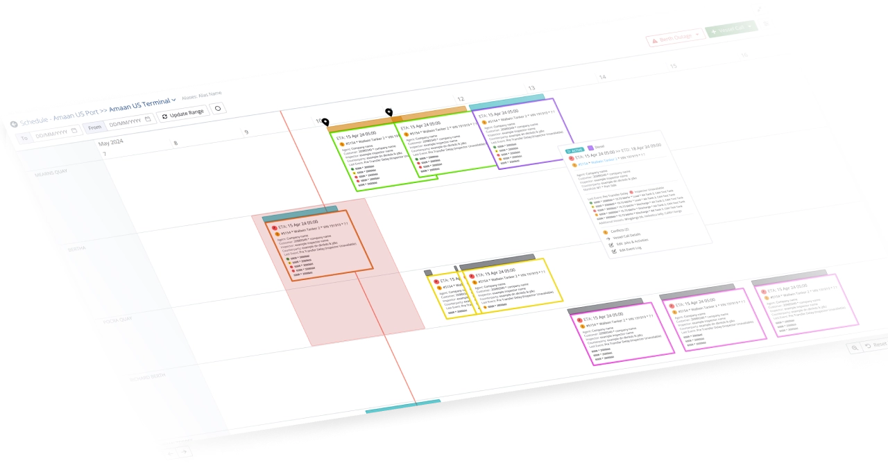 Intuitive vessel call scheduling highlights berthing conflicts, eliminates misunderstandings about berth availability and reduces the complexity of dock outage planning.