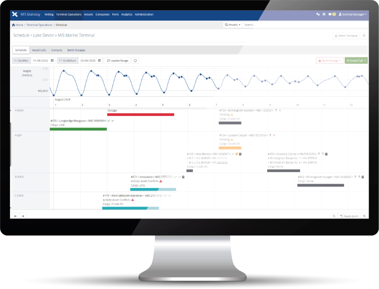 Allow MTO to calculate your estimated departure times accurately. Reduce berth conflicts by eliminating vessel call overlaps. Quickly identify and manage asset conflicts.